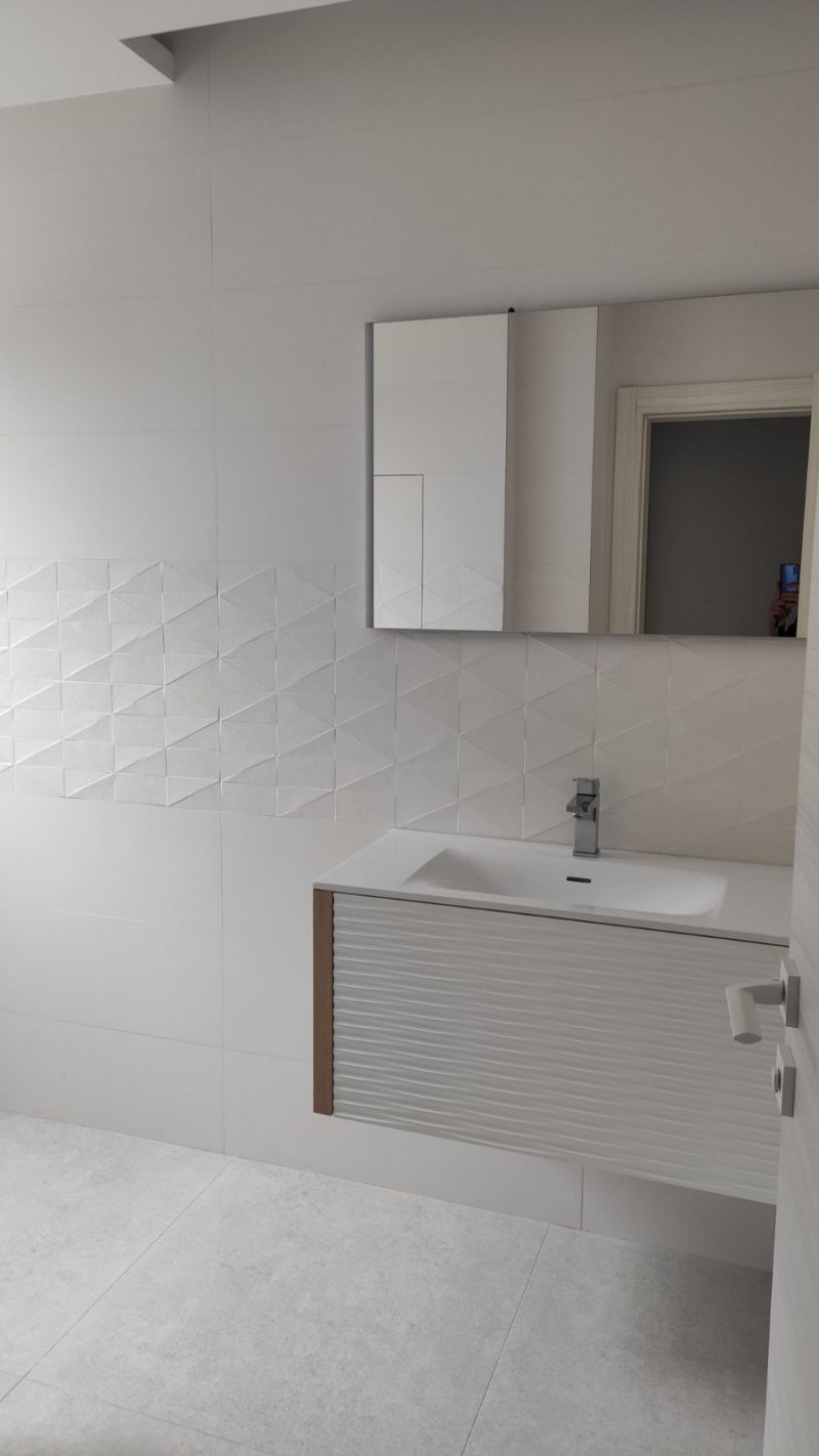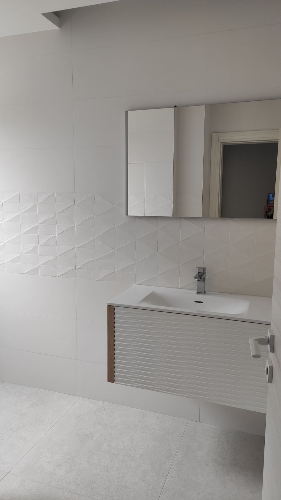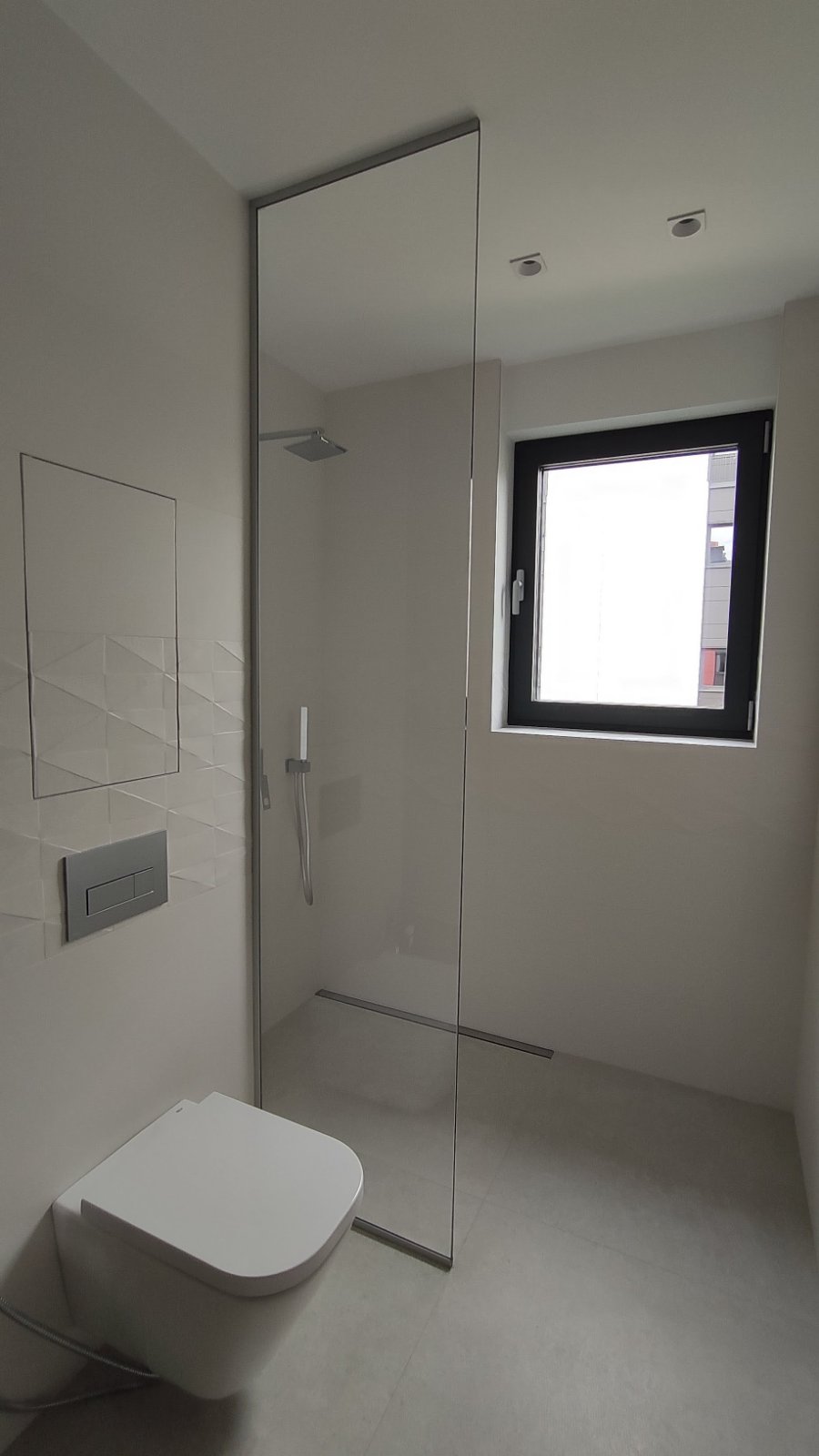 The bathroom is modern and elegant, with a walk-in shower and glass partition, wall-hung toilet, and a vanity with mirror cabinet—completed with high-quality finishes and clean architectural lines.