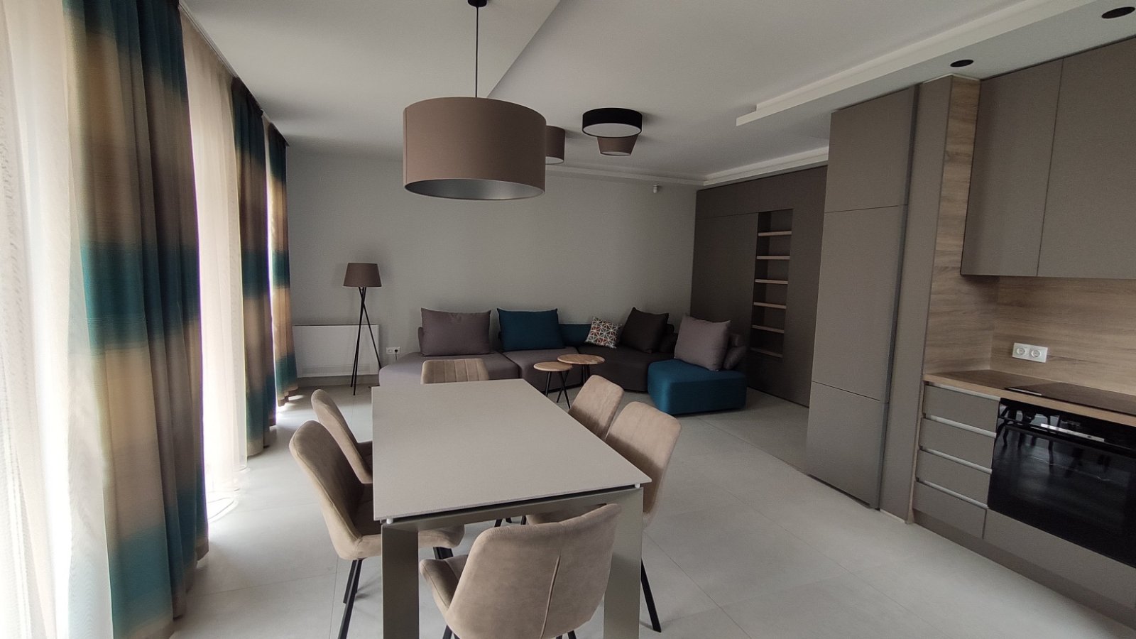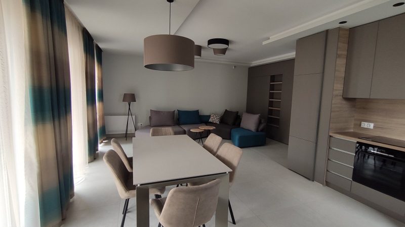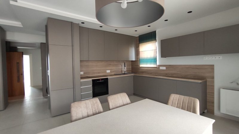 The property features a bright open-plan living, dining and kitchen area, designed for everyday living and entertaining. Large windows bring in abundant natural light, while the neutral palette and warm wood accents create a refined, “hotel-style” atmosphere. The kitchen is finished in a contemporary style with generous storage, a practical worktop and built-in appliances, offering both aesthetics and usability.